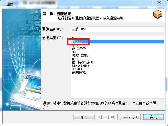 1)新建通道-選擇“以太網(wǎng)”通訊方式,填入通道名稱;