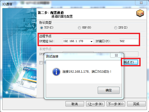 2)配置通道-遠(yuǎn)程節(jié)點(diǎn)中“IP地址”填入BCNet以太網(wǎng)模塊的IP地址“192.168.1.178”, “IP地址”填入“502”,點(diǎn)擊“測(cè)試”,完成配置;
