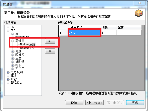 3)新建設(shè)備-在PLC中選擇“莫迪康modbus從站”,填入設(shè)備名稱;