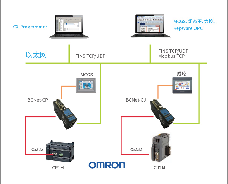 BCNet-CP采用即插即用設(shè)計(jì),不占用PLC通訊口,即編程軟件/上位機(jī)軟件通過以太網(wǎng)對(duì)PLC數(shù)據(jù)監(jiān)控的同時(shí),觸摸屏可以通過復(fù)用接口與PLC進(jìn)行通訊。BCNet-CP支持工控領(lǐng)域內(nèi)絕大多數(shù)SCADA軟件,支持歐姆龍F(tuán)INS TCP/UDP以太網(wǎng)協(xié)議和ModbusTCP兩種通訊方式。