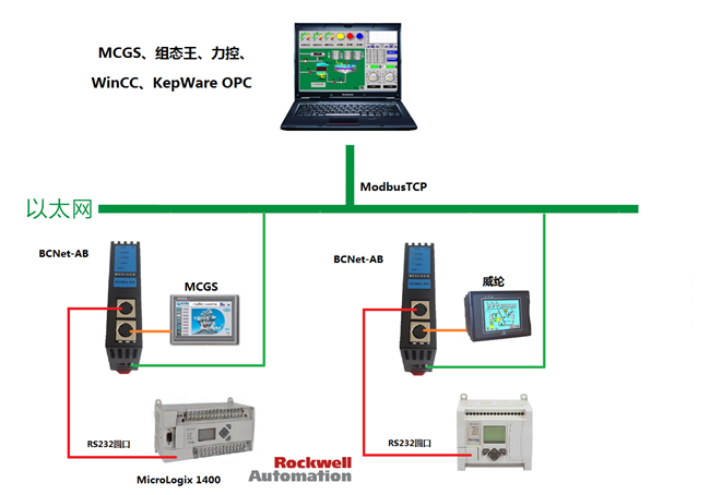 BCNet-AB采用模塊化設計,帶通訊線。不占用PLC編程口,即編程軟件/上位機軟件通過以太網(wǎng)對PLC數(shù)據(jù)監(jiān)控的同時,觸摸屏可以通過復用接口X2與PLC進行通訊。
