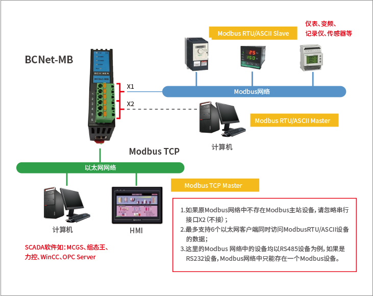 BCNet-MB 是一款經(jīng)濟(jì)型的以太網(wǎng)通訊處理器,是為滿足日益增多的工廠設(shè)備信息化需求(設(shè)備網(wǎng)絡(luò)監(jiān)控和生產(chǎn)管理)而設(shè)計(jì),用于Modbus 串行設(shè)備的以太網(wǎng)數(shù)據(jù)采集(Modbus RTU/ASCII 轉(zhuǎn)Modbus TCP),非常方便構(gòu)建生產(chǎn)管理系統(tǒng)。