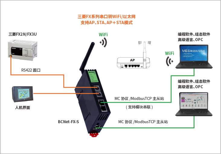 產(chǎn)品簡(jiǎn)介 BCNet-FX-S用于三菱FX1S/1N/2N/3S/3G/3GA/3GC/3U/3UC系列、匯川、士林AX、禾川、維控等PLC以太網(wǎng)數(shù)據(jù)采集,非常方便構(gòu)建生產(chǎn)管理系統(tǒng)。模塊集成WiFi功能,支持AP模式、STA模式和AP+STA模式,帶膠棒和磁吸天線,方便構(gòu)建WiFi網(wǎng)絡(luò),直接通過WiFi進(jìn)行PLC編程、數(shù)據(jù)采集。不占用PLC編程口,上位機(jī)通過以太網(wǎng)對(duì)PLC數(shù)據(jù)監(jiān)控的同時(shí),觸摸屏可以通過復(fù)用接口X2與PLC進(jìn)行通訊。支持工控領(lǐng)域內(nèi)絕大多數(shù)SCADA軟件,支持三菱MC以太網(wǎng)協(xié)議和ModbusTCP主從站通訊。 支持點(diǎn)表探測(cè)功能。