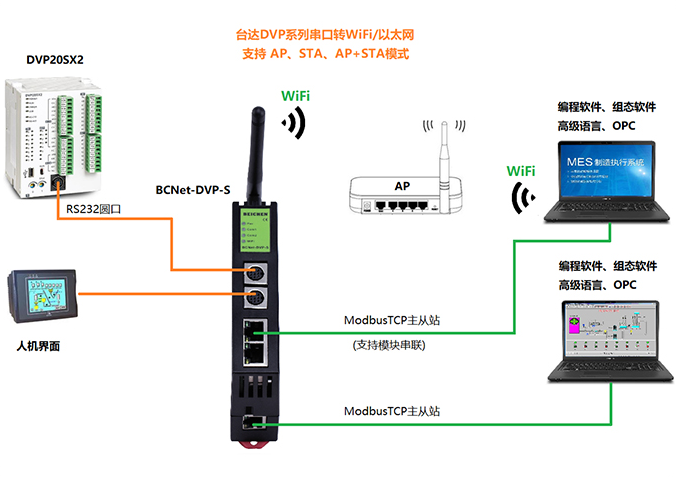 產品簡介 BCNet-DVP-S用于臺達DVP系列PLC的以太網數(shù)據(jù)采集,非常方便構建生產管理系統(tǒng)。模塊集成WiFi功能,支持AP模式、STA模式和AP+STA模式,帶膠棒和磁吸天線,方便構建WiFi網絡,直接通過WiFi進行PLC編程、數(shù)據(jù)采集。?BCNet-DVP-S采用即插即用設計,不占用PLC通訊口,即編程軟件/上位機軟件通過以太網對PLC數(shù)據(jù)監(jiān)控的同時,觸摸屏可以通過復用接口與PLC進行通訊,支持工控領域內絕大多數(shù)SCADA軟件,支持臺達以太網協(xié)議和ModbusTCP通訊方式。