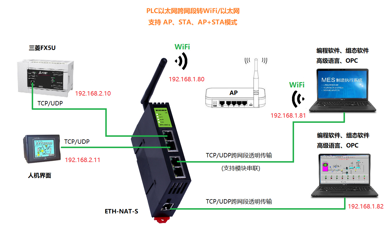ETH-NAT-S適用于所有網(wǎng)口PLC(TCP/UDP協(xié)議)網(wǎng)絡(luò)通訊和數(shù)據(jù)采集,兼有跨網(wǎng)段和透明傳輸?shù)墓δ?。車間單個(gè)設(shè)備,如果具有相同的IP地址,則可以轉(zhuǎn)換成不同的IP地址,進(jìn)行數(shù)據(jù)采集;車間多個(gè)設(shè)備,不同網(wǎng)段的IP地址,則可以統(tǒng)一成同一網(wǎng)段的IP地址,進(jìn)行數(shù)據(jù)采集。 模塊集成WiFi功能,支持AP模式、STA模式和AP+STA模式,帶膠棒和磁吸天線,方便構(gòu)建WiFi網(wǎng)絡(luò),直接通過WiFi進(jìn)行PLC編程、數(shù)據(jù)采集和跨網(wǎng)段訪問。