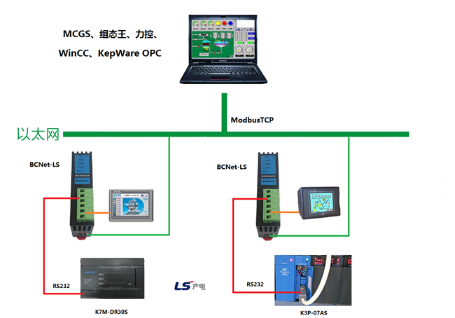 BCNet-LS采用模塊化設(shè)計,不占用PLC編程口,即編程軟件/上位機軟件通過以太網(wǎng)對PLC數(shù)據(jù)監(jiān)控的同時,觸摸屏可以通過復(fù)用接口X2與PLC進行通訊。