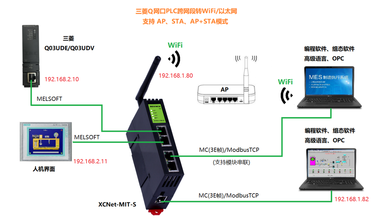 XCNet-MIT-S具備LAN1、LAN2兩個物理性接口,可將LAN1口所連接PLC的IP地址和端口號,映射到LAN2口的任意IP和端口號。XCNet-MIT-S可將LAN1口的三菱MELSOFT協(xié)議自動映射成LAN2口的ModbusTCP協(xié)議和MC(3E幀)服務(wù)器。 模塊集成WiFi功能,支持AP模式、STA模式和AP+STA模式,帶膠棒和磁吸天線,方便構(gòu)建WiFi網(wǎng)絡(luò),直接通過WiFi進(jìn)行PLC編程、數(shù)據(jù)采集、數(shù)據(jù)交換和跨網(wǎng)段訪問。